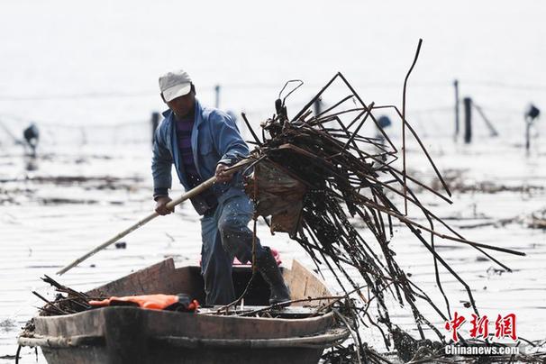 2月26日,西湖园林工作人员正在装载残荷。近日,浙江杭州开始了一年一度的西湖残荷清理作业,以保护西湖水质,让来年荷花开得更盛。