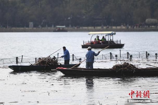 2月26日,两位园林工作人员正在清理残荷。近日,浙江杭州开始了一年一度的西湖残荷清理作业,以保护西湖水质,让来年荷花开得更盛。