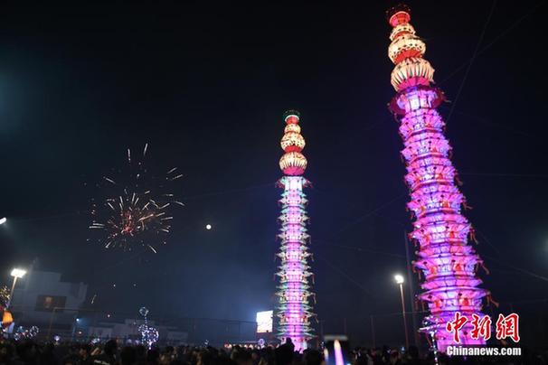 3月1日,高大的花灯与远处的烟花遥相呼应。当日,浙江温岭上王村举行元宵特色民俗展示活动,24米高的“王氏大彩灯”亮相现场,为即将到来的元宵佳节增添喜庆。