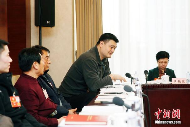 3月5日下午,全国政协十三届一次会议举行小组会议,分组讨论政府工作报告。图为姚明委员在体育界小组讨论上发言。