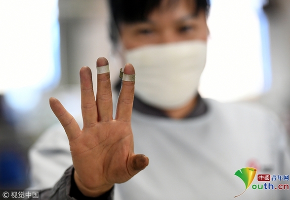 2018年3月6日,在广西柳州市恒达巴士公司点钞中心,一名女工展示点钞时受伤的手指。