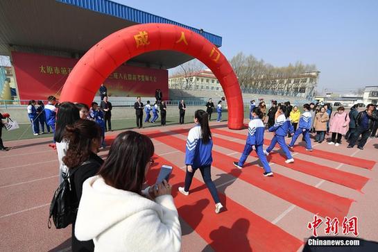 3月13日,山西太原,太原市第五十五中学为即将步入18岁的高三学生举行成人仪式,学生们在家长的见证下依次跨入“成人门”。
