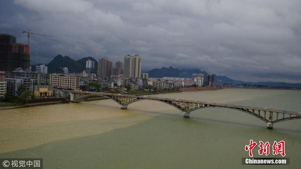 2018年3月19日,广西柳州融江融安县江段出现泾渭分明的现象。受南支槽及低层偏南气流影响,连日来,融安县出现强降雨过程,融江支流浪溪江出现今年首个大暴雨天气过程,暴雨过后,珠江上游的融江出现一清一浑、泾渭分明的现象。
