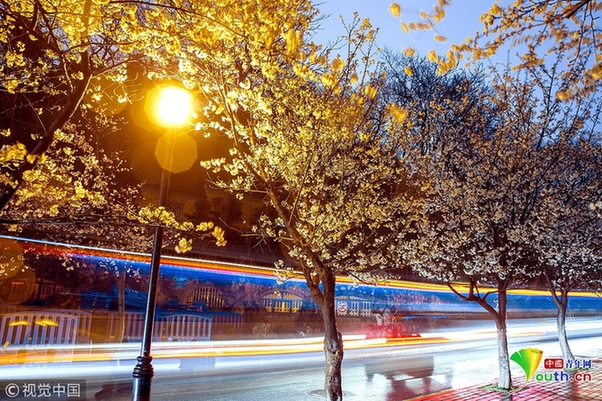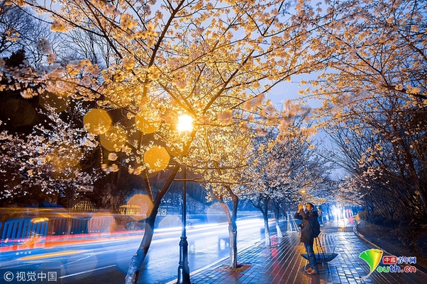 2018年3月20日,南京,南京鸡鸣寺路两旁樱花盛开,夜幕降临,樱花与灯光相互映衬,美不胜收。