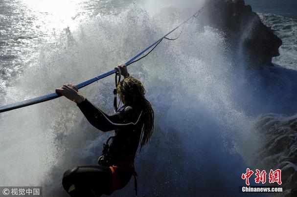 幸亏保护措施得当,避免坠落海水之中。图为ndreyKarr被巨浪拍下绳索的瞬间。