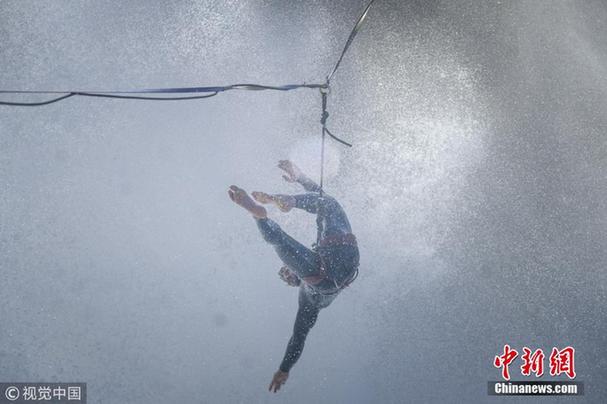 2018年3月22日消息,葡萄牙娜萨瑞,冒险家AndreyKarr挑战架在两处悬崖中间高15米、长达30米的扁带行走。