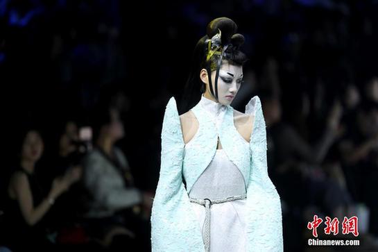 3月26日,模特展示毛戈平设计的彩妆造型。当日,东方印记·2018毛戈平MGP彩妆造型发布在北京举行。毛戈平以中华文化为基底,从蕴含着古老东方哲学的古典诗词、绘画、服饰等元素汲取灵感,注入本次造型设计,演绎了东方美学的摩登风尚。