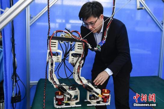 3月27日,广东工业大学黄之峰副教授和团队的仿人机器人。仿人机器人Jet-HR1(喷射仿人机器人1号),重6.5千克,高65厘米, 形状像人的下半身,两只脚掌前端装有形似“风火轮”的涵道风机引擎。涵道风机助力的方案成功使Jet-HR1能够在调整自身重心维持平衡下,跨越其他双足机器人无法跨越的宽沟。