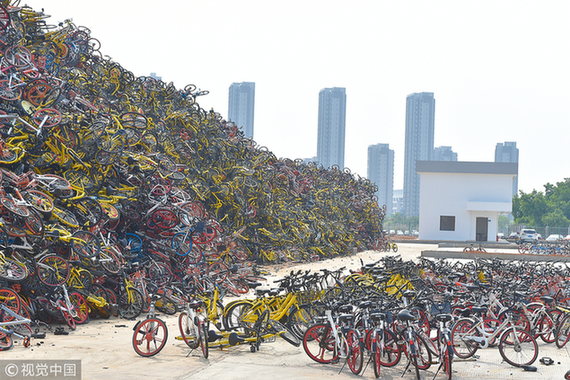 10万辆共享单车堆积如山 层层叠叠色彩多样
