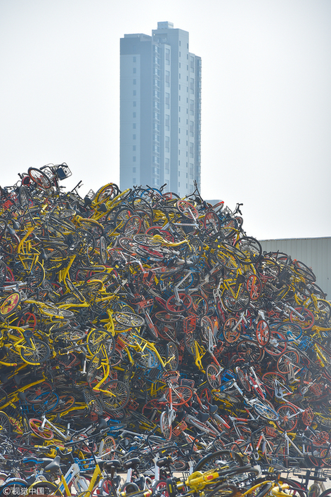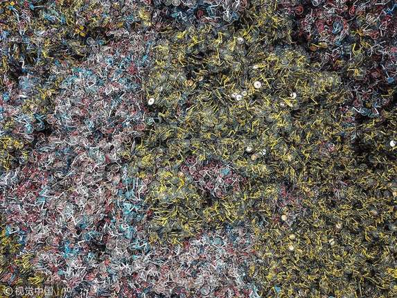 2018年3月27日,福建省厦门市,在同安区一块7500平方米的空地上,十万多辆共享单车扭叠在一起,密密麻麻。