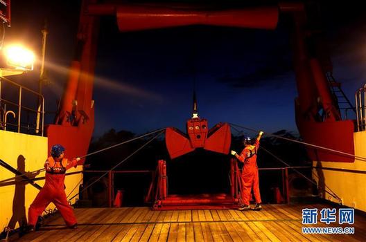 3月27日,“科学”号工程技术人员准备将电视抓斗放入海中。当日,“科学”号考察船的电视抓斗在西太平洋麦哲伦海山区进行深海采样。“科学”号的电视抓斗由我国自主研制,主要用于获取深海海底的表层松散岩石、沉积物等样品,可通过光纤实时传回海底的视频图像,最大工作水深达6000米。
