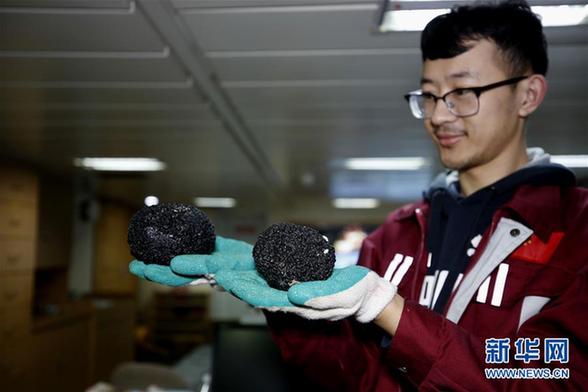 4月1日,“科学”号上的考察队员张吉展示在海山采集的岩石样品。海山是世界海洋生物多样性研究的热点地区。在国家科技基础资源调查专项“西太平洋典型海山生态系统科学调查”支持下,“科学”号科考船在西太平洋麦哲伦海山全面展开综合调查。