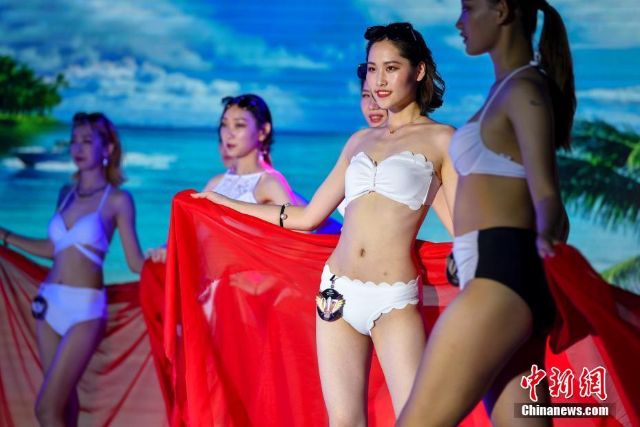 5月26日晚,2018第十七届精功(国际)模特大赛海南赛区决赛在海口举行。42名入围选手经过“个性时装与眼镜”、“热辣泳装与太阳镜”、“高贵华丽晚礼服”三轮比赛环节的角逐后,最终15号选手吴纪莹摘得女子组桂冠,105号哈萨克斯坦选手宋清获男子组冠军。图为参赛选手正在进行泳装环节的展示。