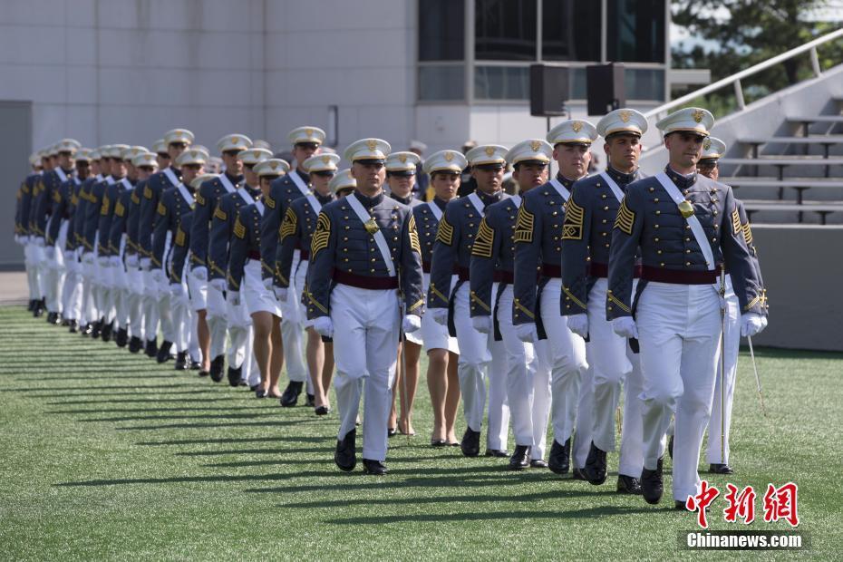 当地时间5月26日,美国著名军事院校西点军校在位于纽约州西点镇的校园体育场举行2018届毕业生的毕业典礼,972名军校学员经过四年学习后毕业,学员们入场参加毕业典礼。西点军校创办于1802年,是美国第一所军事学校。图为华人毕业生王谦爱(前排中)在毕业典礼上扔起军帽。