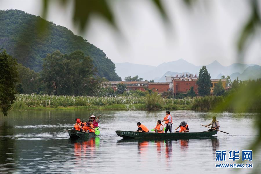 游人在普者黑国家湿地公园荡舟休闲(5月26日摄)。近日,云南省文山壮族苗族自治州丘北县普者黑国家湿地公园山水秀丽、风景如画,吸引游人前来荡舟赏景。普者黑以水上田园、岩溶湿地、荷花世界、湖泊峰林等景观著称。