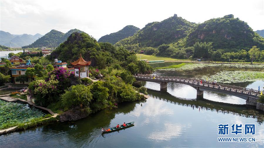 这是5月26日无人机拍摄的普者黑国家湿地公园一景。近日,云南省文山壮族苗族自治州丘北县普者黑国家湿地公园山水秀丽、风景如画,吸引游人前来荡舟赏景。普者黑以水上田园、岩溶湿地、荷花世界、湖泊峰林等景观著称。