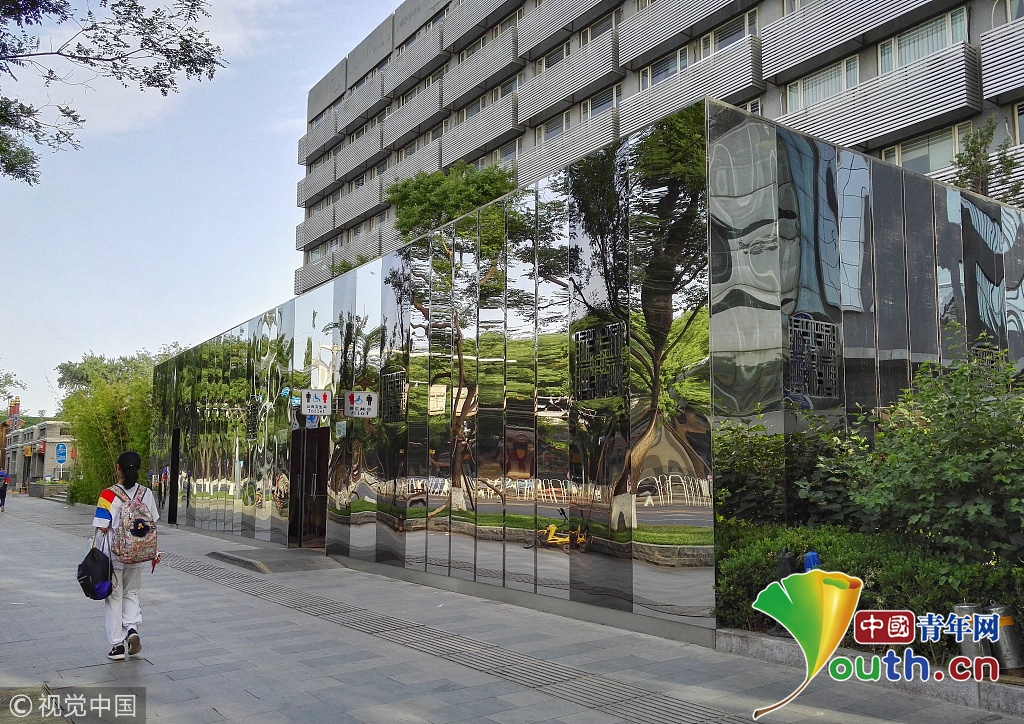 5月28日,北京,簋街有一座特别亮的厕所,镜面的外墙和极简的形态别具风格,白天厕所外墙就像一面面大镜子,反射映照着大街上的一切。晚上出来遛弯的附近居民纷纷掏出手机拍照,衬着金黄色的路灯,这座能反光的厕所也变成了金色。白天烈日炎炎在阳光的照射下镜面外墙表面的温度很高,厕所旁边专门摆放了小心烫伤的提示牌。
