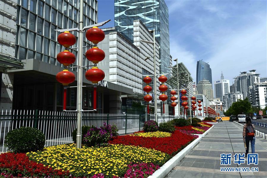 这是在青岛市市南区东海路拍摄的沿街景观(5月31日摄)。随着上合组织青岛峰会的临近,青岛市主城区道路两侧张灯结彩,五彩缤纷的花卉、绿植景观营造出浓郁的盛会氛围,喜迎宾朋。