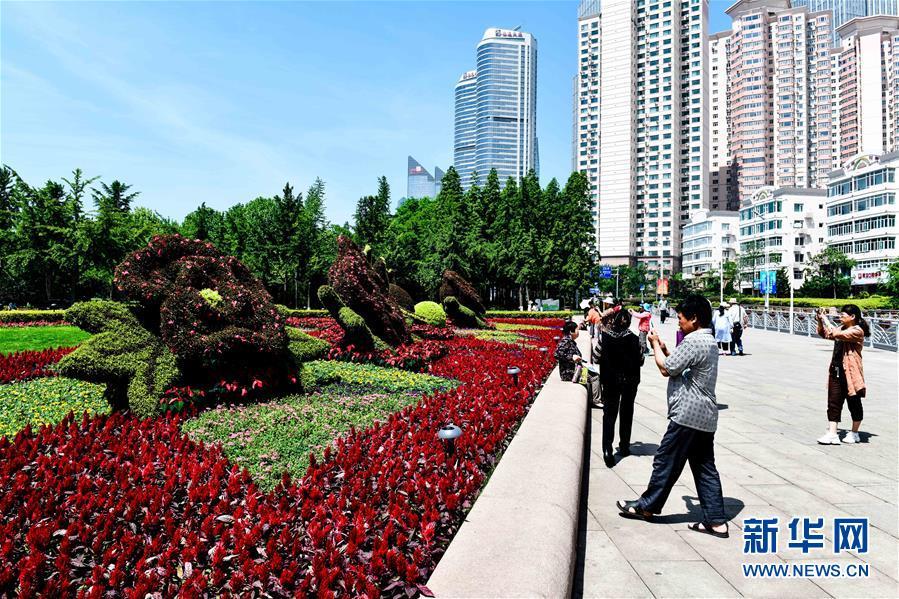 5月31日,游客在青岛市五四广场参观游玩。随着上合组织青岛峰会的临近,青岛市主城区道路两侧张灯结彩,五彩缤纷的花卉、绿植景观营造出浓郁的盛会氛围,喜迎宾朋。