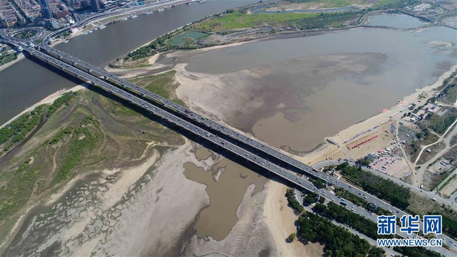 松花江哈尔滨段跨江大桥下因低水位露出大面积河床(6月2日无人机拍摄)。