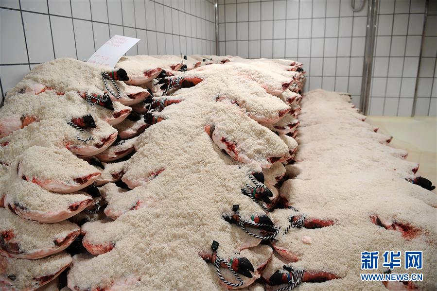 5月31日,在西班牙萨拉曼卡市的一处火腿加工厂,新鲜猪腿被埋入盐堆腌制。