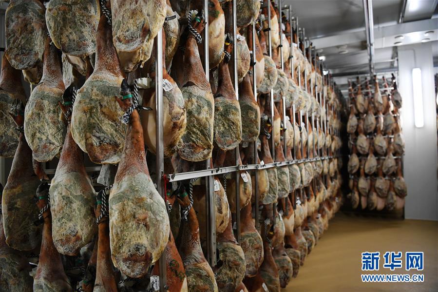 5月31日,在西班牙萨拉曼卡市的一处火腿加工厂,腌制好的猪腿在恒温恒湿的冷库中存放。