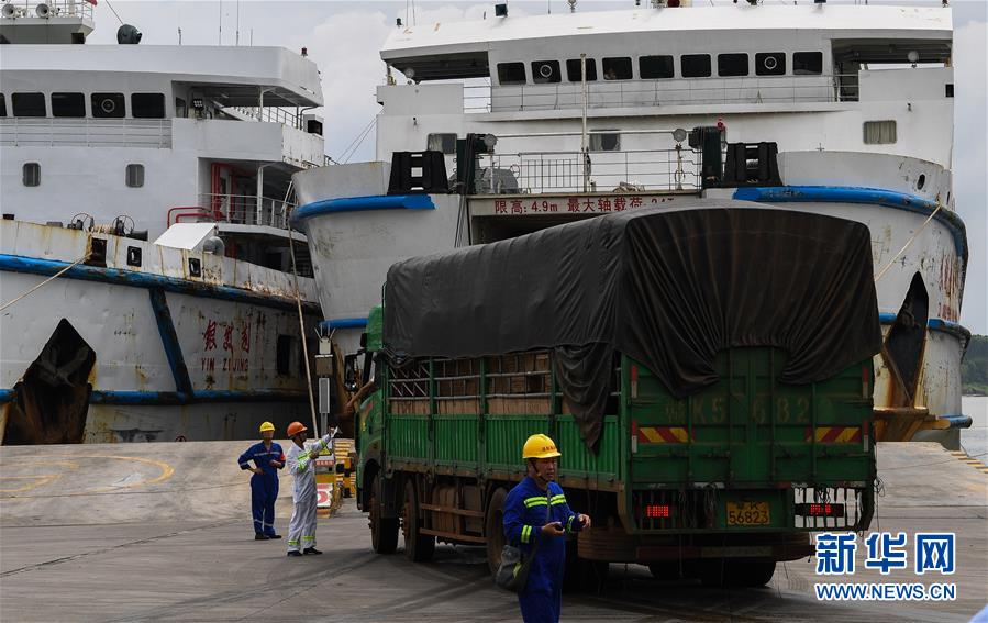 6月7日,广东省徐闻县海安港工作人员在指挥货车上船。