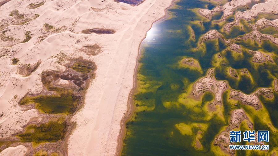 在内蒙古鄂尔多斯市杭锦旗境内的库布其沙漠腹地,由汛期的黄河水汇聚而成的湿地在日光照射下显现出绚丽多彩的颜色,形成沙水共存的独特景观(6月9日无人机拍摄)。