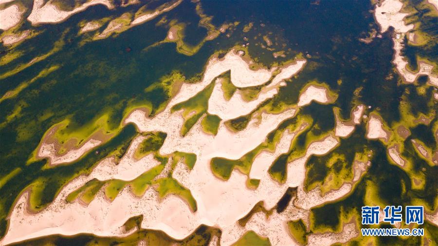 在内蒙古鄂尔多斯市杭锦旗境内的库布其沙漠腹地,由汛期的黄河水汇聚而成的湿地在日光照射下显现出绚丽多彩的颜色,形成沙水共存的独特景观(6月9日无人机拍摄)。