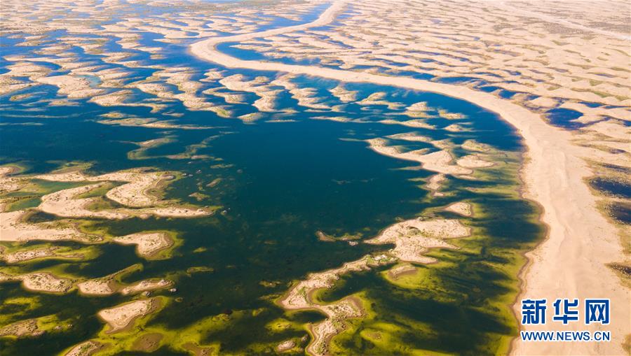 在内蒙古鄂尔多斯市杭锦旗境内的库布其沙漠腹地,由汛期的黄河水汇聚而成的湿地在日光照射下显现出绚丽多彩的颜色,形成沙水共存的独特景观(6月9日无人机拍摄)。