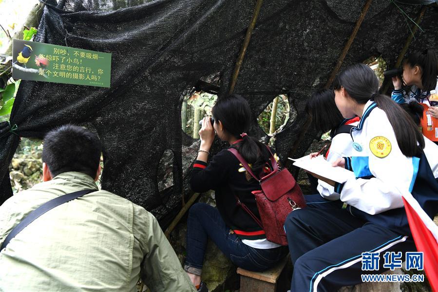 在弄岗村陇享屯,观鸟爱好者在农伟宏的观鸟点观鸟(3月29日摄)。 “嘘,别出声,它们来了!”顺着村民农伟宏手指的方向望去,只见多只个头小巧、褐色羽毛的小鸟扑啦啦飞进密林,落在岩石上。霎时,在一处伪装棚后面,响起了一阵急促的相机快门声。鸟儿飞临的地方,位于中越边境广西龙州县逐卜乡弄岗村陇享屯,一个壮族聚居的小山村,临近弄岗国家级自然保护区。农伟宏他们祖祖辈辈居住在这喀斯特岩溶山弄里,满眼绿水青山却长期收入微薄、贫困难除。他们不曾想到,一群鸟儿的“出现”,改变了小山村的面貌和自己的生活。
