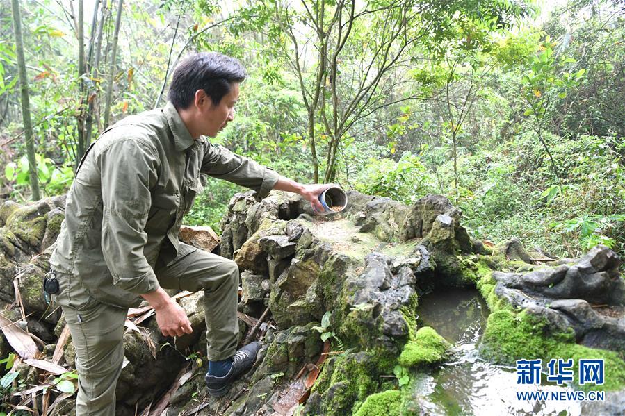 弄岗村陇享屯村民农伟宏在观鸟点为鸟儿放食(3月29日摄)。 “嘘,别出声,它们来了!”顺着村民农伟宏手指的方向望去,只见多只个头小巧、褐色羽毛的小鸟扑啦啦飞进密林,落在岩石上。霎时,在一处伪装棚后面,响起了一阵急促的相机快门声。鸟儿飞临的地方,位于中越边境广西龙州县逐卜乡弄岗村陇享屯,一个壮族聚居的小山村,临近弄岗国家级自然保护区。农伟宏他们祖祖辈辈居住在这喀斯特岩溶山弄里,满眼绿水青山却长期收入微薄、贫困难除。他们不曾想到,一群鸟儿的“出现”,改变了小山村的面貌和自己的生活。