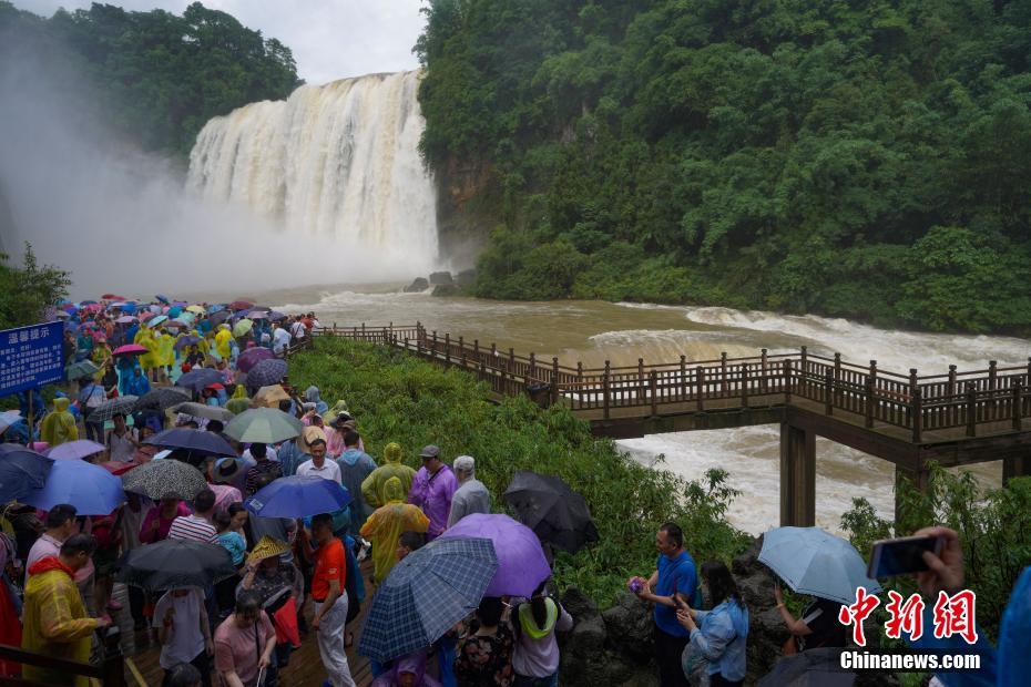 6月23日,贵州黄果树瀑布壮观景象吸引大批游客观赏。受近日持续降雨影响,位于贵州省安顺市的黄果树瀑布进入丰水期。