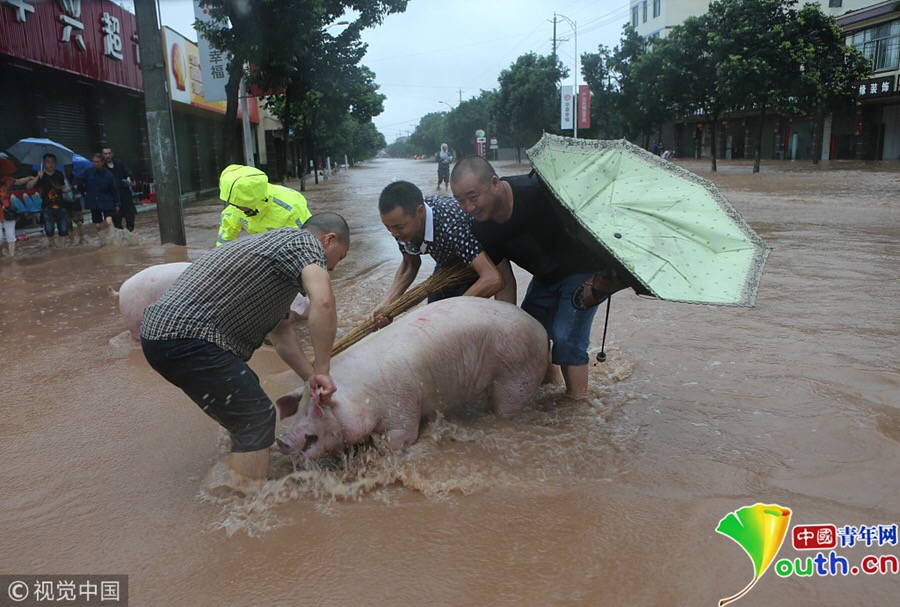 成都暴雨蒲江多处被淹 交警帮助养殖户转移猪群