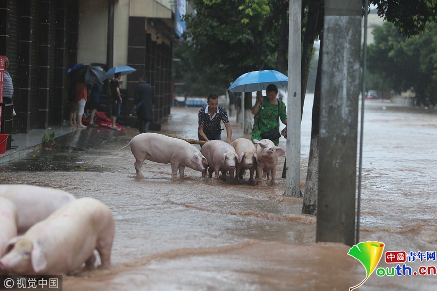 成都暴雨蒲江多处被淹 交警帮助养殖户转移猪群