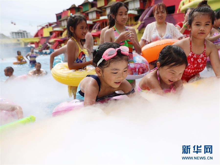 7月17日,市民在重庆洋人街水上乐园戏水纳凉。当日是入伏第一天,重庆市出现高温天气。众多市民走到户外,戏水纳凉。