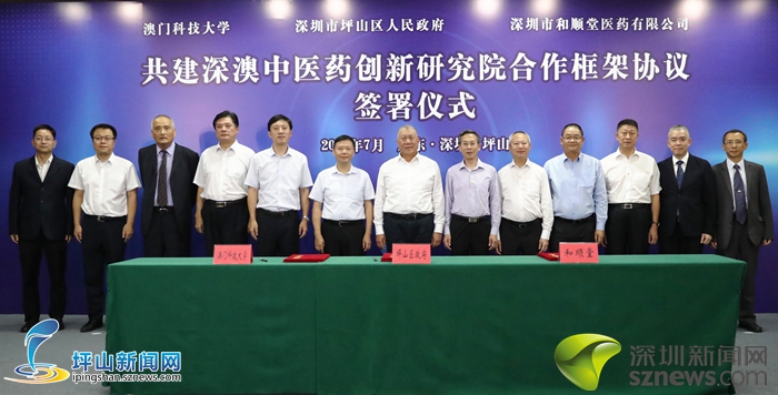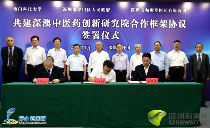 深圳新闻网坪山讯(记者 杨涛)2018年7月5日下午,深圳市坪山区人民政府、澳门科技大学、深圳市和顺堂医药有限公司共建深澳中医药创新研究院合作框架协议签署仪式在坪山区和顺堂精品中药生产基地举行。全国政协副主席何厚铧,广东省政协副主席黄武,市政协常务副主席刘润华,全国人大代表、澳门发展策略研究中心会长萧志伟,全国政协委员、澳门基金会主席吴志良,澳门科技大学副校长唐嘉乐、姜志宏,坪山区委书记、区长陶永欣等领导、嘉宾见证签约仪式。这次活动是何厚铧副主席在深调研粤港澳大湾区建设活动的重要一环,是坪山区积极参与粤港澳大湾区建设的重要举措。