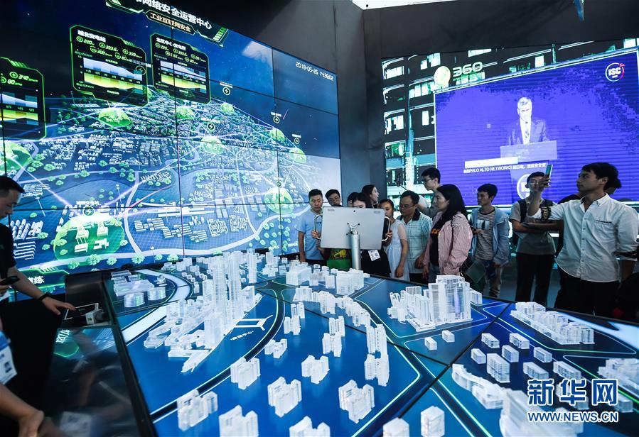 在贵州省贵阳市举行的2018中国国际大数据产业博览会上,参观者在参观城市网络安全运营中心(5月26日摄)。本次数博会上,无人驾驶、虚拟试衣镜等“黑科技”引人关注。新华社记者陶亮摄