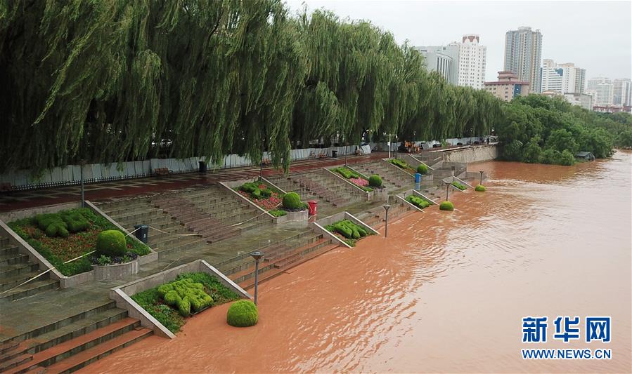 被水浸没的黄河兰州段亲水平台已经封闭(7月23日无人机拍摄)。