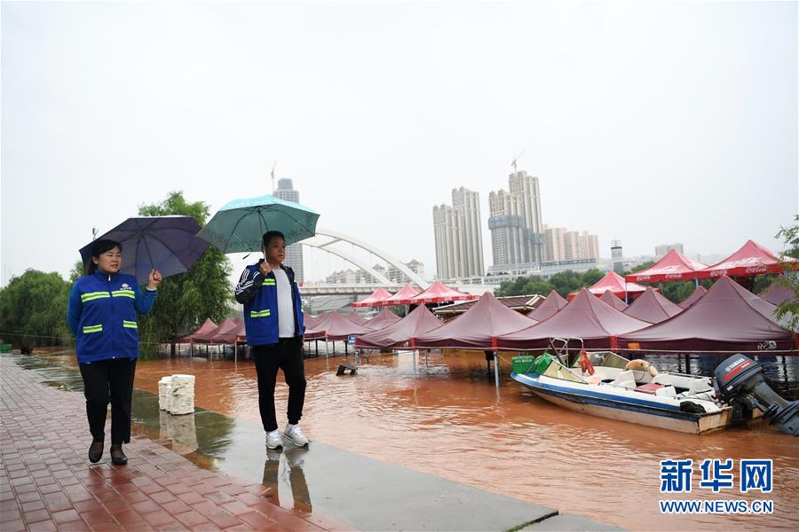 7月23日,兰州市雁南街道办事处工作人员在兰州市体育公园黄河岸边巡查。
