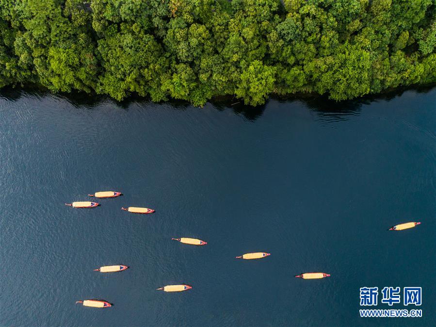 7月23日,游客乘船在新安江浙江建德段江面上游玩(无人机拍摄)。盛夏时节,清澈的新安江江水从浙江省建德市城区穿流而过,水温保持在17℃,给建德城区带来清凉,吸引市民和游客前来休闲纳凉。17℃江水也成为建德当地夏季旅游的主打品牌。