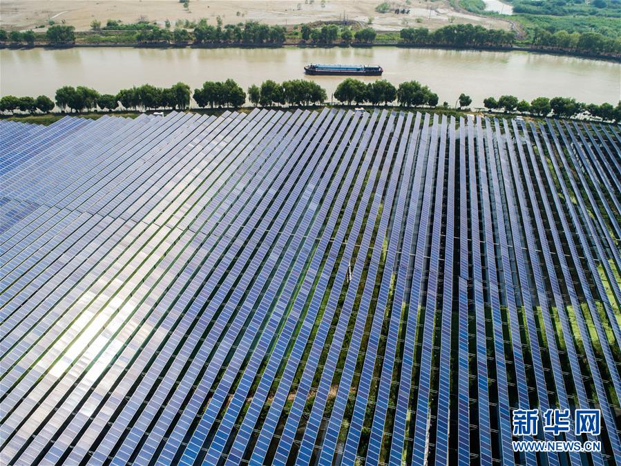 空中俯瞰湖州市和孚镇陈塔村的“渔光互补”光伏发电项目(7月25日无人机拍摄)。