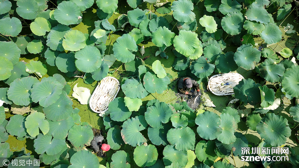 2018年7月25日,江苏淮安,种植户在挖藕带。
