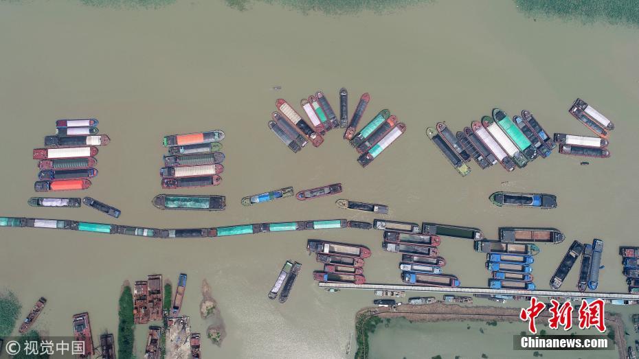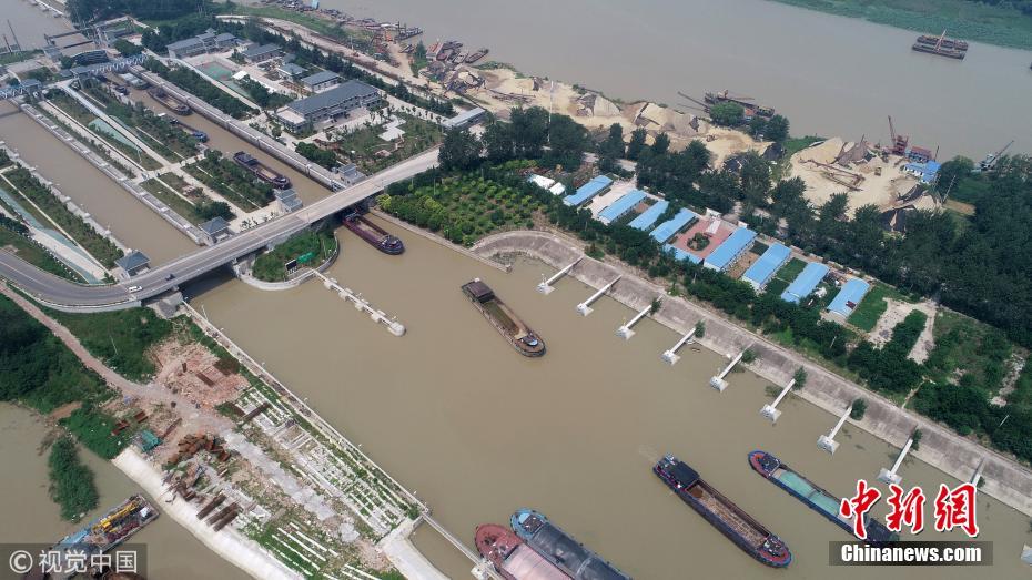 2018年7月25日,江苏淮安,洪泽湖洪泽区高良涧三线船闸上下游水域,近千艘船舶正排队过闸,连绵数里场面十分壮观。因受前期台风安比影响,停泊了几天的船舶于24日涌入洪泽区高良涧水域等待过闸,目前,海事部门正加强巡航管理,现场维护秩序,确保船舶航行有序安全。