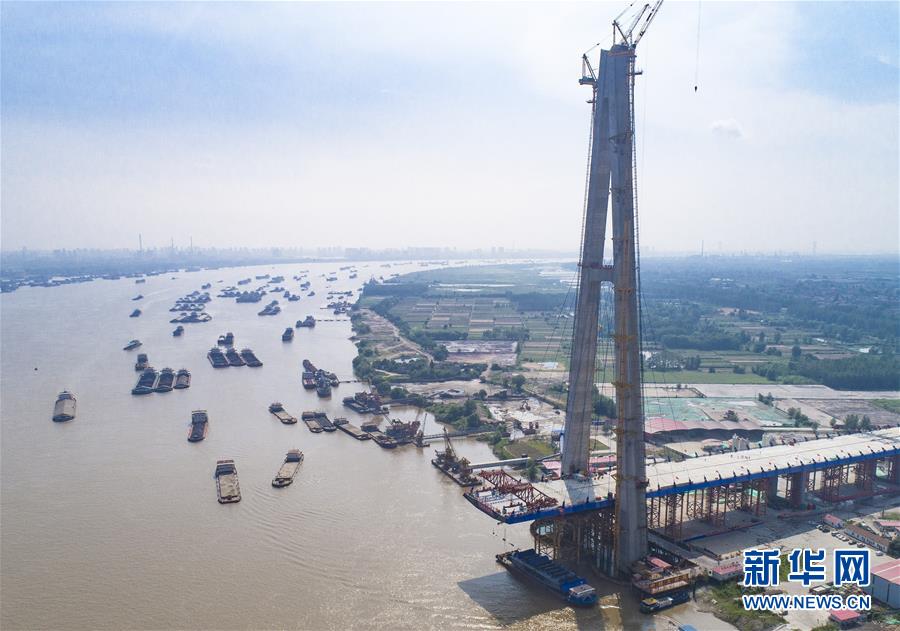 武汉青山长江大桥南岸主跨首节钢梁架设成功(8月8日无人机拍摄)。