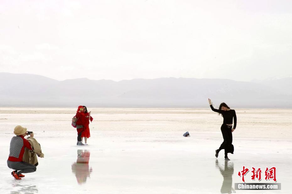 4月26日,历经6个月封闭升级改造的青海茶卡盐湖开始迎客,游客踏入卤水湖及盐雕群,畅享中国版“天空之镜”。图为游客在盐湖拍照。