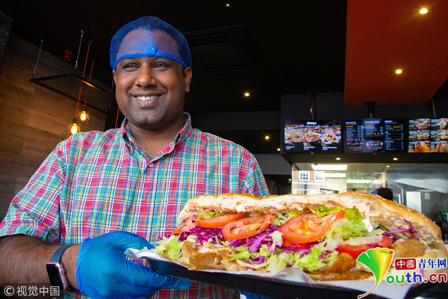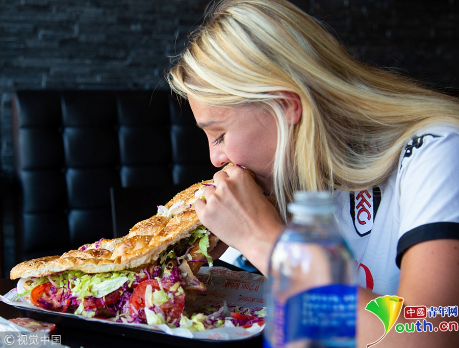 当地时间2018年8月8日,英国伦敦,著名美食博主Kate Ovens应邀来到 German Doner Kebab 餐厅挑战一份号称是“伦敦最大”的土耳其烤肉饼。