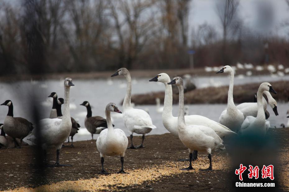 三、四月之间,大批迁徙途中的苔原天鹅(亦称“小天鹅”)在加拿大安大略省艾尔默镇(Aylmer)暂歇,成为当地一景。图为当地时间3月30日,近千只小天鹅与加拿大雁在艾尔默的湿地短暂栖息。当地的野生动物管理区设有候鸟观测点。这些天鹅每年在美国马里兰州的切萨皮克湾(Chesapeake Bay)过冬,初春时节长途跋涉飞往阿拉斯拉方向进行繁育。