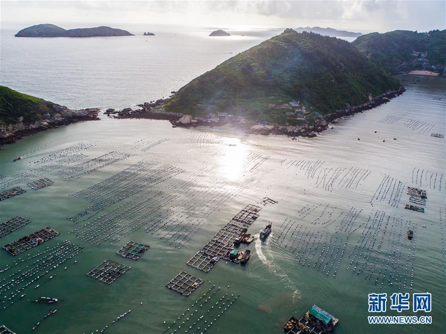 8月19日,空中俯瞰南麂岛海域内的“海上牧场”养殖区(无人机拍摄)。南麂岛位于浙江东南海域,水质好,水温、盐度都适合大黄鱼等养殖鱼类的生长繁殖,因此当地的水产品也一直保持了较高的品质和口碑。进入8月,浙江省温州市平阳县南麂镇海域上大片的大黄鱼、贻贝等特色海产品养殖区域迎来丰收季节,养殖户们驾驶渔船在养殖区海域进行打捞收获,在碧海蓝天下构成了一幅“海上牧场”的美丽丰收景象。近年来,南麂镇政府引导渔民养殖户充分发挥“靠海吃海”的资源优势,大力发展海洋养殖经济和海岛旅游经济,实现了南麂由“生态美”向“产业美”,“产业美”向“经济美”的转变。同时该镇坚持以大黄鱼、贻贝等为特色产业支撑,精准发展高效海洋养殖业,重点培养一批新型职业渔民,依靠专业技术支持,实现深海仿生养殖,让好生态造就好品质,重点打造南麂养殖品牌,组建营销网络,拓展特色海产品市场。