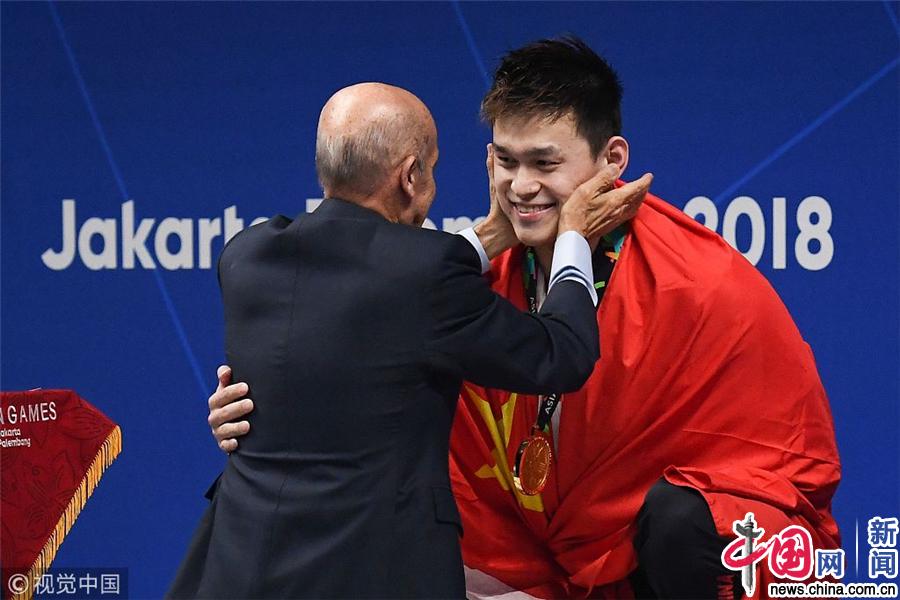 8月20日,中国选手孙杨在颁奖仪式上。当日,在第18届亚运会男子800米自由泳决赛中,中国选手孙杨以7分48秒36的成绩夺冠。